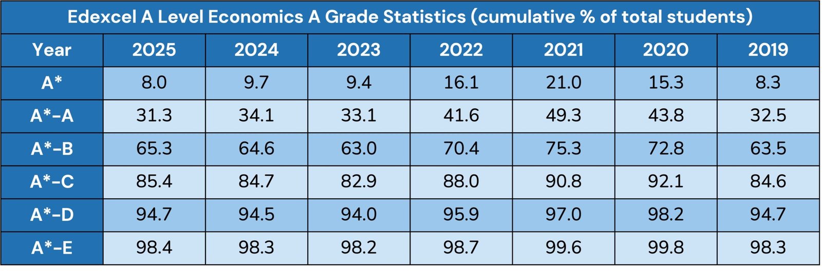 Economics A* grades nationally remain competitive. Historically, only around 8% of students achieve an A*, making it one of the tougher subjects at the top end. If an A* is your target, you’ll need to be consistently scoring in the high 70% range across your papers in practice.